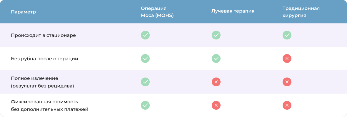 В отличие от стандартной процедуры, при проведении операции Моса (MOHS) гистопатолог просматривает все края резекции во время операции. Пациент уходит домой с уверенностью в радикальности удаления, не ждёт 7-10 дней результат гистологии, который, кстати, может быть ложноотрицательным.